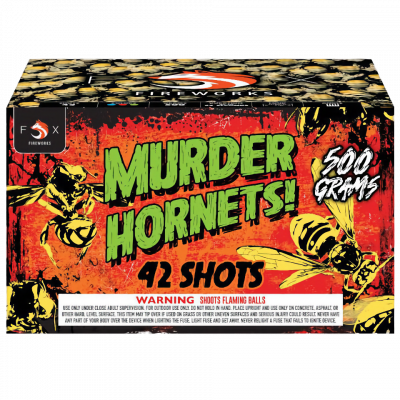 Murder Hornets from Fox Fireworks is buzzing with action! This 42 shot is full of rapid fire, sizzling breaks with multi color. A great show opener or a furious finale cake.